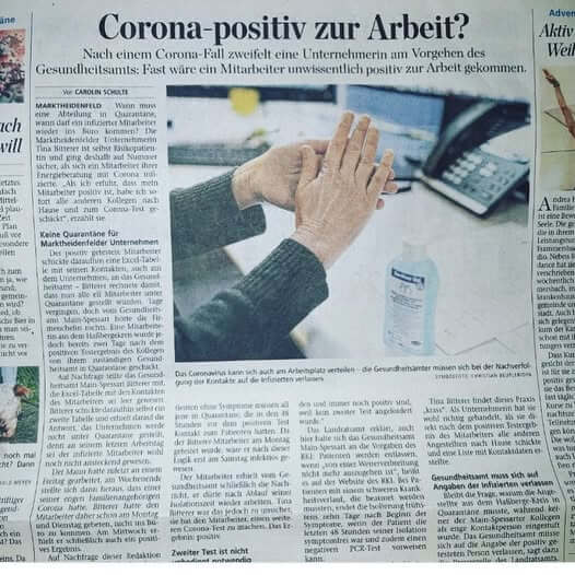Die Main-Post unterstützte öffentlich unsere Meinung und Vorgehensweise zum Thema Corona. Nachdem zu Beginn der Pandemie ein Mitarbeiter „Corona positiv“ zurück zur Arbeit kommen sollte und das laut Gesundheitsamt genehmigt wurde, stellte ich mich auf die Barrikaden! Alle Unternehmen müssen Quarantäne Maßnahmen vollziehen und dann sollen nicht vollständig Genesene zurück zur Arbeit? Nicht mit uns!